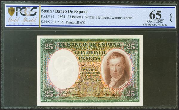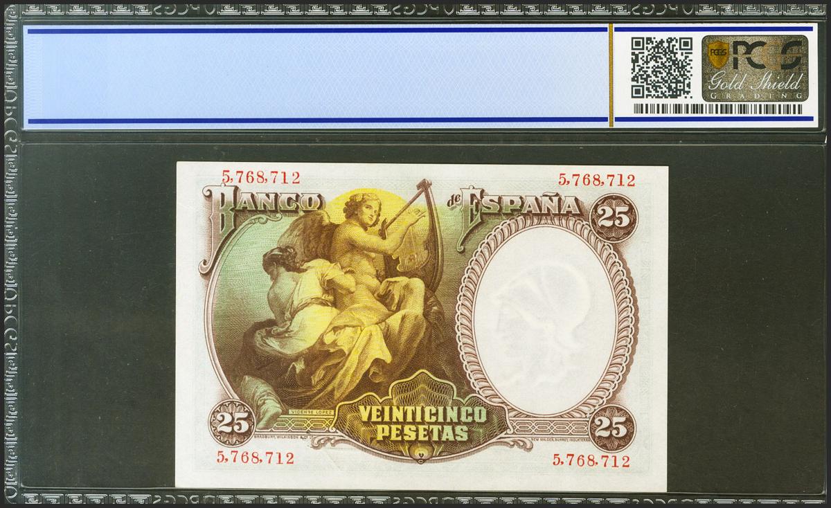 25 Pesetas. 25 de Abril de 1931. Sin serie. (Edifil 2021: 358, Pick: 81). Inusual en esta excepcional calidad, apresto original. SC. Encapsulado PCGS65OPQ.