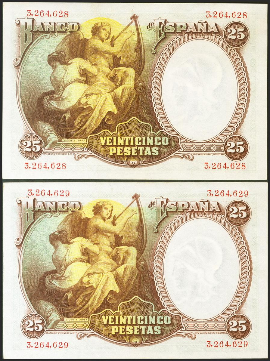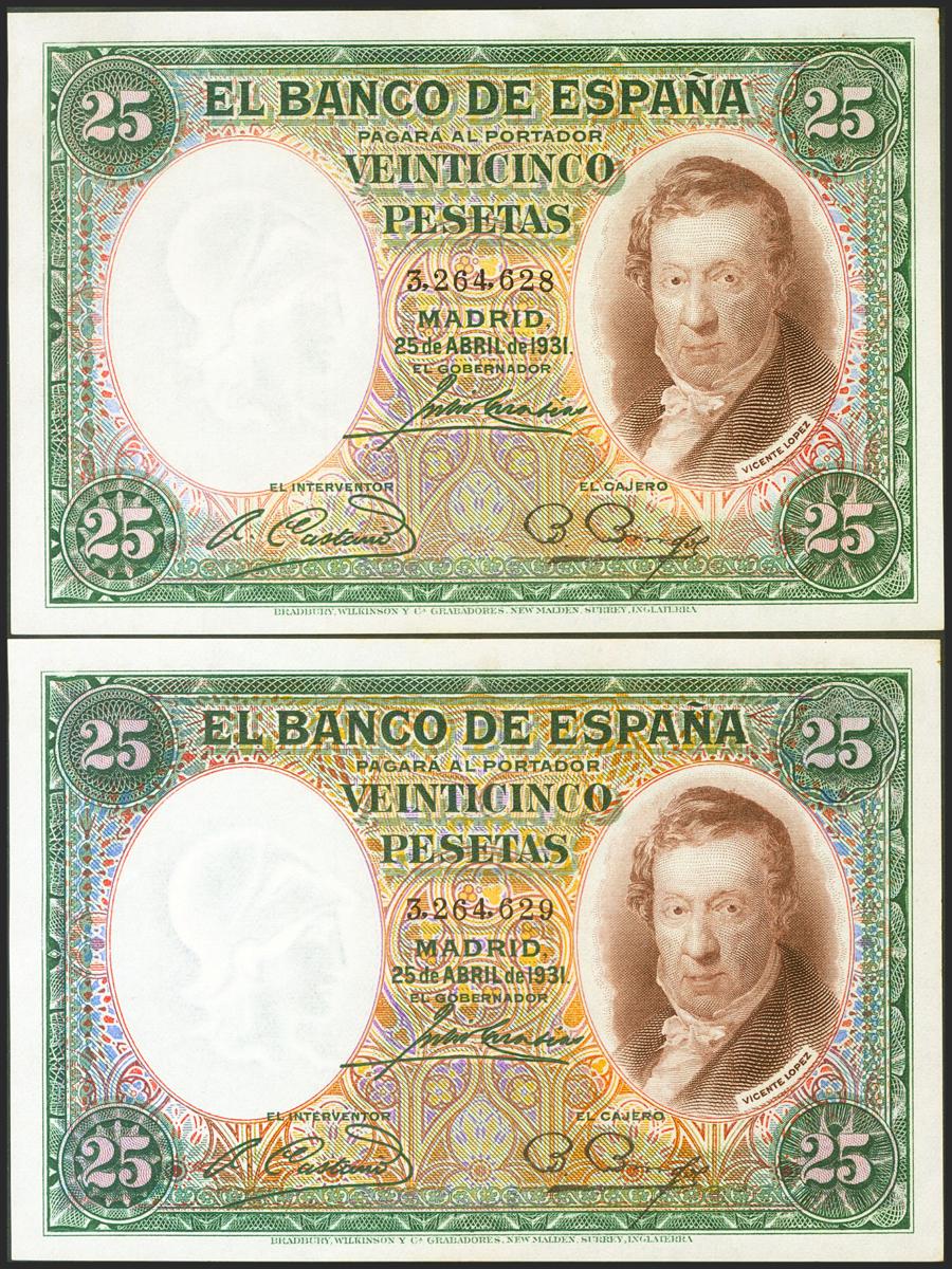 25 Pesetas. 25 de Abril de 1931. Pareja correlativa. Sin serie. (Edifil 2021: 358). Apresto original. SC.