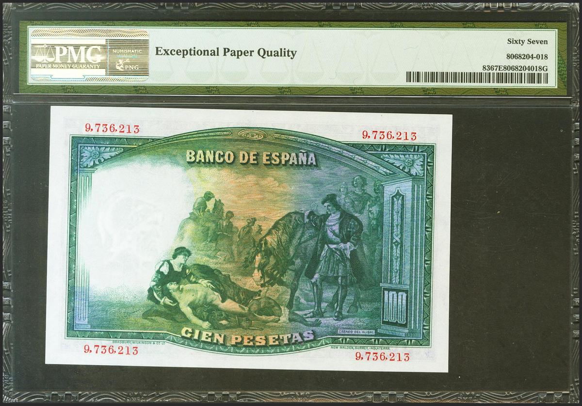 100 Pesetas. 25 de Abril de 1931. Sin serie. (Edifil 2021: 360, Pick: 83). Raro en esta excepcional calidad, apresto original. SC. Encapsulado PMG67EPQ.