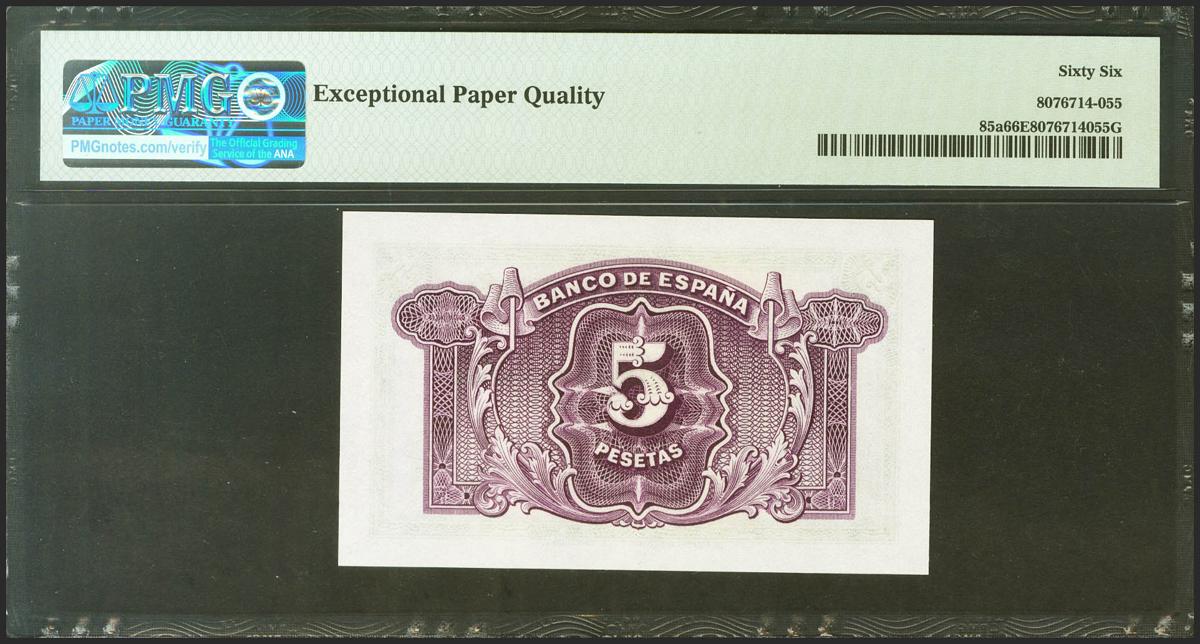 5 Pesetas. 1935. Certificado de Plata. Sin serie. (Edifil 2021: 363, Pick: 85a). Inusual en esta excepcional calidad, apresto original. SC. Encapsulado PMG66EPQ.