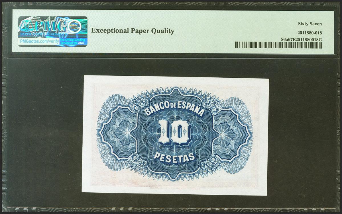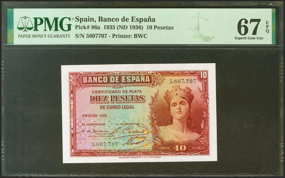 10 Pesetas. 1935. Certificado de Plata. Sin serie. (Edifil 2021: 364, 86a). Raro en esta excepcional calidad, apresto original. SC. Encapsulado PMG67EPQ.