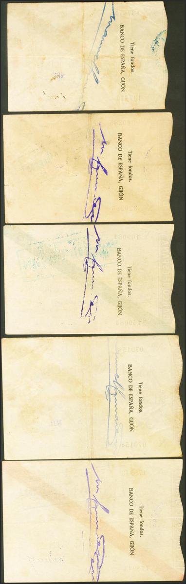 Conjunto de 5 billetes de 5 Pesetas, 10 Pesetas, 25 Pesetas, 50 Pesetas y 100 Pesetas emitidos por la sucursal de Gijón el 5 de Noviembre de 1936. (Edifil 2021: 380/84). Conjunto de enorme calidad, recordamos que estos billetes muy raramente se encuentran en calidades altas. EBC-/MBC+.