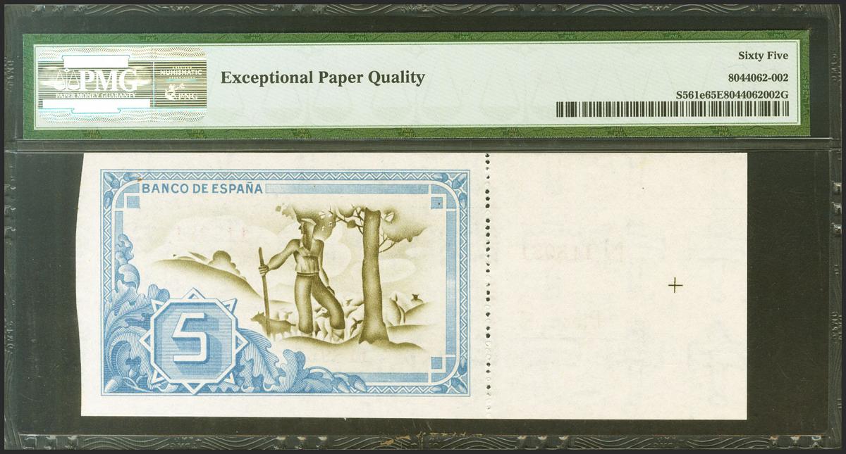 5 Pesetas. 1 de Enero de 1937. Serie A y antefirma Banco Urquijo Vascongado, matriz a la izquierda. (Edifil 2021: 386f, Pick: S561e). Apresto original. SC. Encapsulado PMG65EPQ.