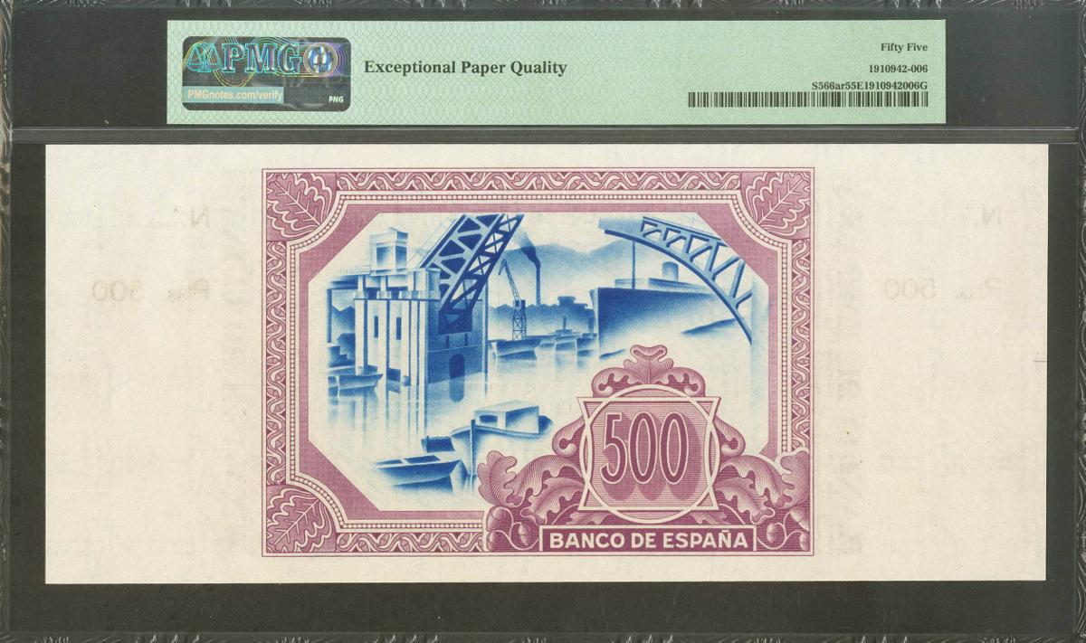 500 Pesetas. 1 de Enero de 1937. Sucursal de Bilbao, antefirma Caja de Ahorros y Monte de Piedad Municipal de Bilbao. Sin serie, sin numeración y con ambas matrices. (Edifil 2021: NE26h, Pick: S566ar). Muy raro en esta calidad. EBC+. Encapsulado PMG55EPQ.