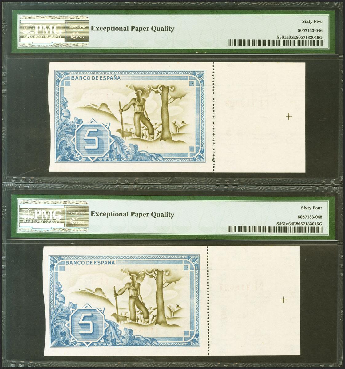 5 Pesetas. 1 de Enero de 1937. Pareja correlativa. Serie A, con matriz a la izquierda y antefirma del Banco Urquijo Vascongado. (Edifil 2021: 387f, Pick: S561a). Apresto original. SC. Encapsulados PMG65EPQ/64EPQ.