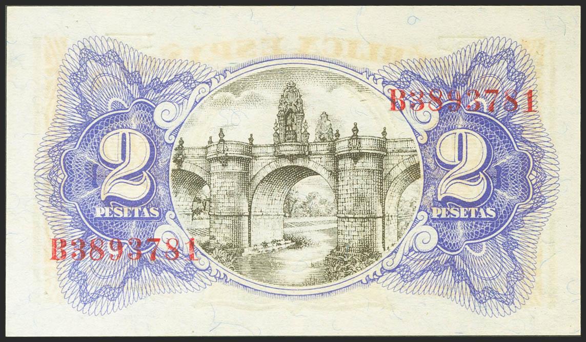 2 Pesetas. 1937. Ministerio de Hacienda. Serie B. (Edifil 2021: 393). Apresto original. SC.
