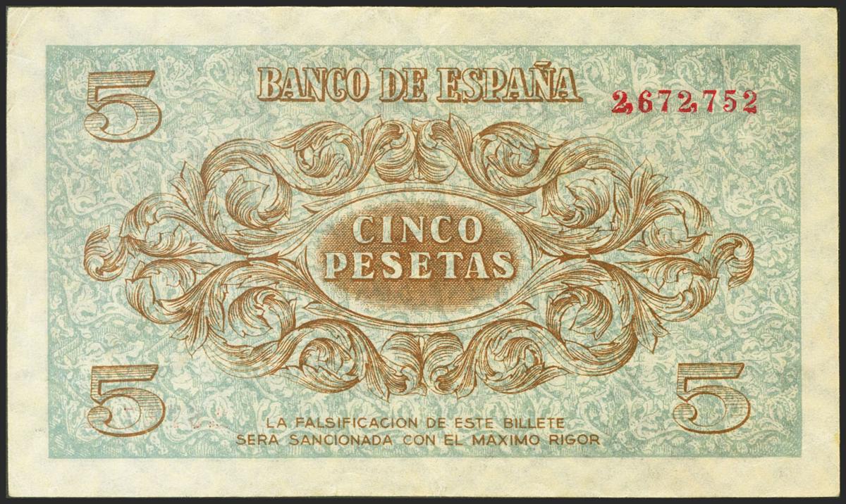 5 Pesetas. 21 de Noviembre de 1936. Sin serie. (Edifil 2021: 417). Raro, conserva gran parte del apresto original. EBC.