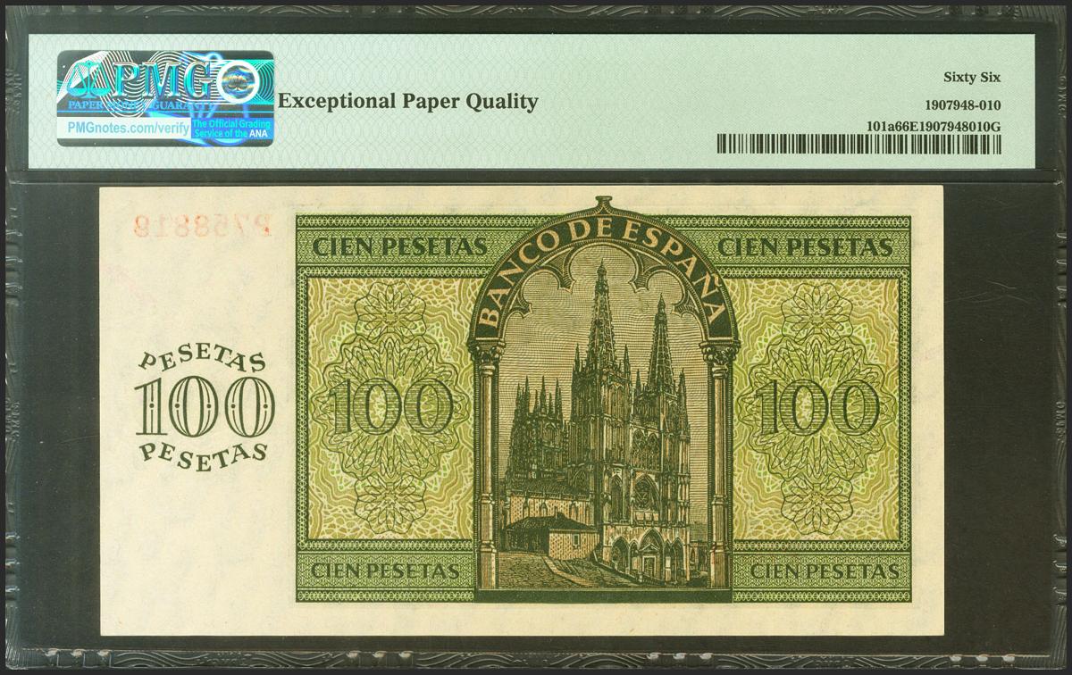 100 Pesetas. 21 de Noviembre de 1936. Serie P. (Edifil 2021: 421a, Pick: 101a). Inusual en esta excepcional calidad, apresto original. SC. Encapsulado PMG66EPQ.