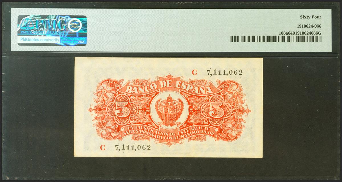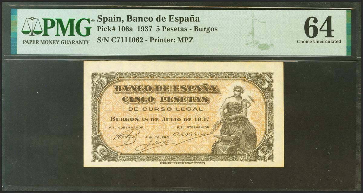 5 Pesetas. 18 de Julio de 1937. Serie C, última serie emitida. (Edifil 2021: 424a, Pick: 106a). Inusual. SC. Encapsulado PMG64.