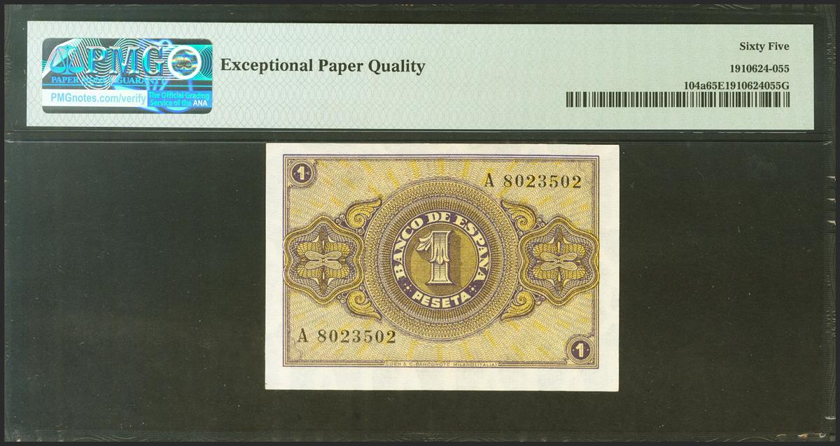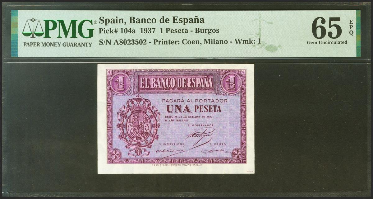 1 Peseta. 12 de Octubre de 1937. Serie A. (Edifil 2021: 425, Pick: 104a). Inusual en esta excepcional calidad, apresto original. SC. Encapsulado PMG65EPQ.