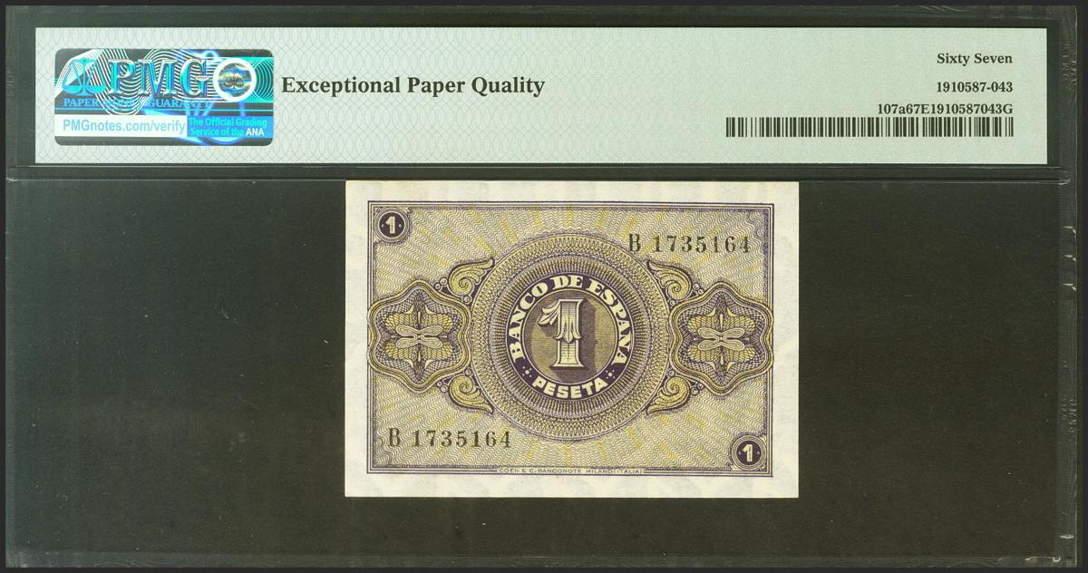 1 Peseta. 28 de Febrero de 1938. Serie B. (Edifil 2021: 427a, Pick: 107a). Raro en esta excepcional calidad, apresto original. SC. Encapsulado PMG67EPQ.