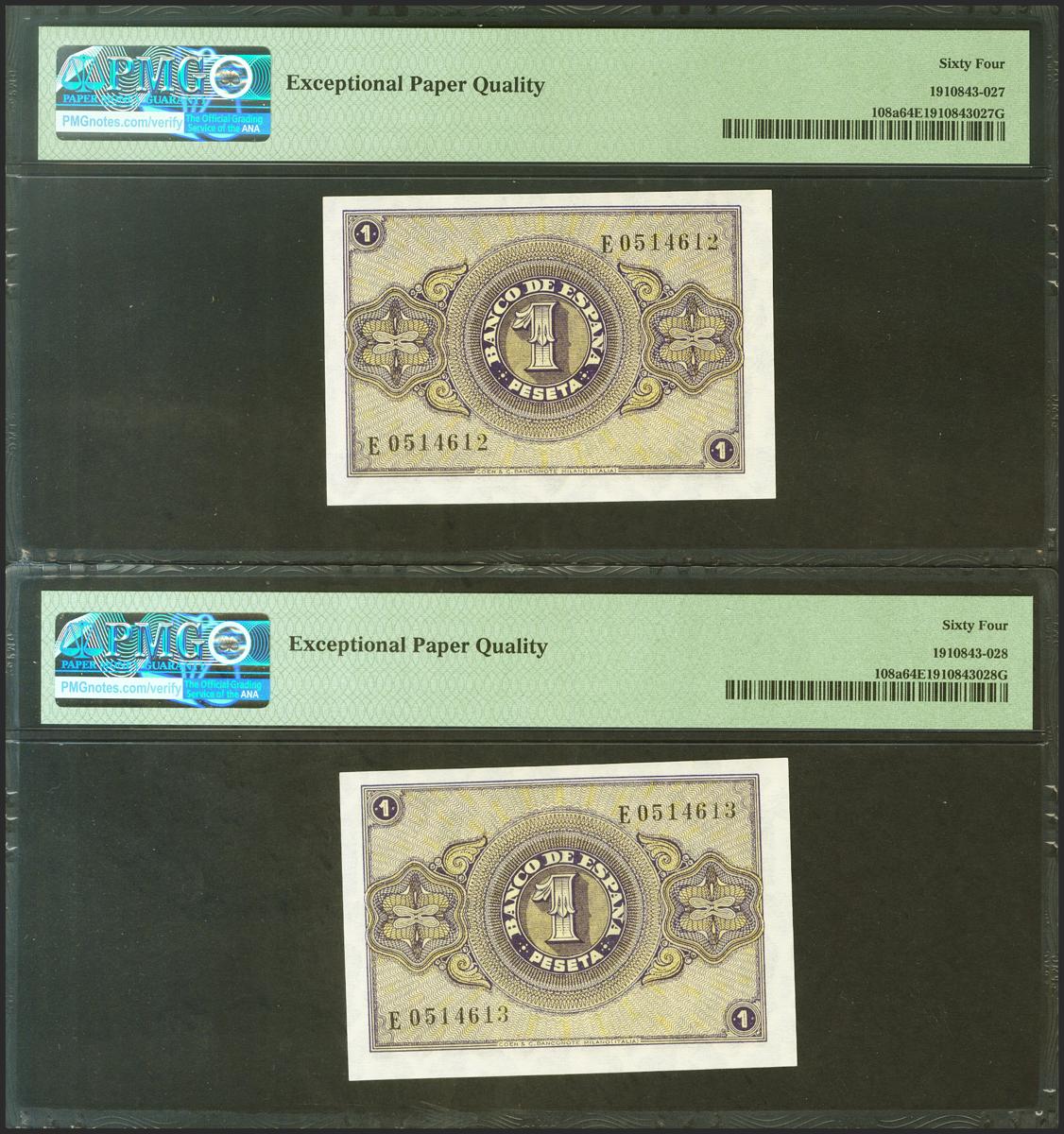 1 Peseta. 30 de Abril de 1938. Pareja correlativa. Serie E. (Edifil 2021: 428a, Pick: 108a). Apresto original. SC. Encapsulados PMG64EPQ, ambos.