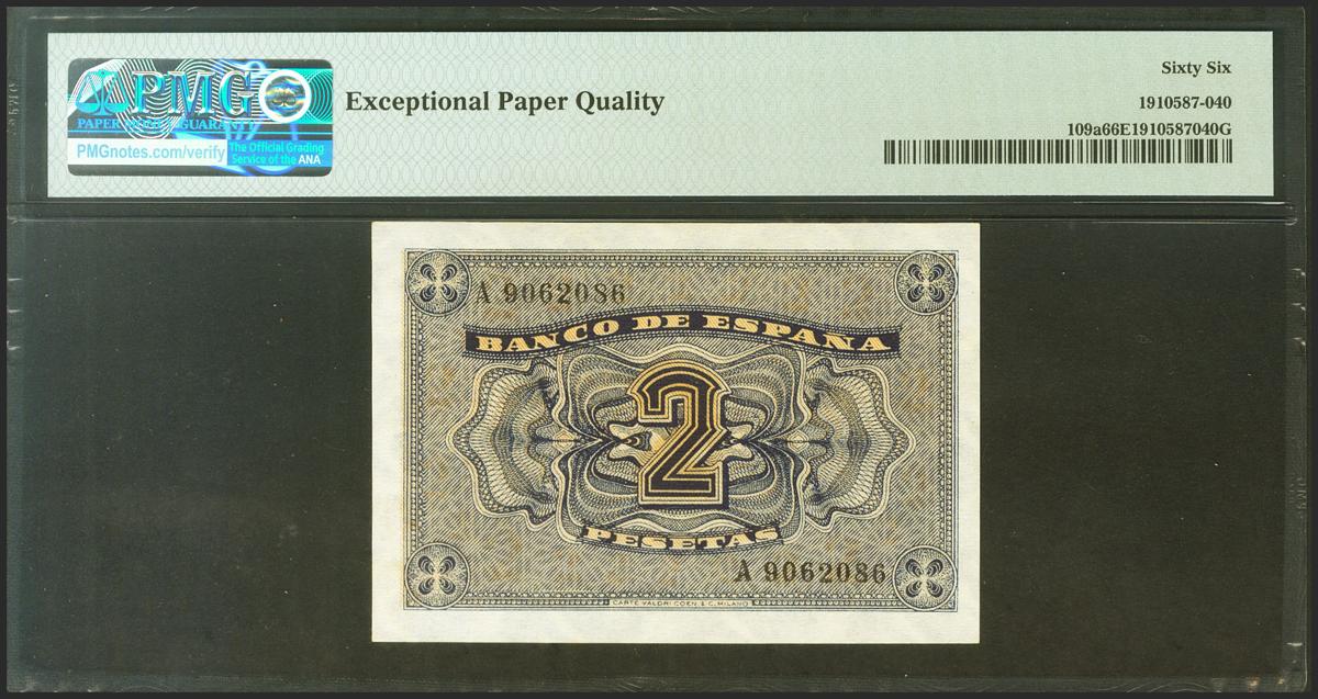 2 Pesetas. 30 de Abril de 1938. Serie A. (Edifil 2021: 429, Pick: 109a). Raro en esta excepcional calidad, apresto original. SC. Encapsulado PMG66EPQ.