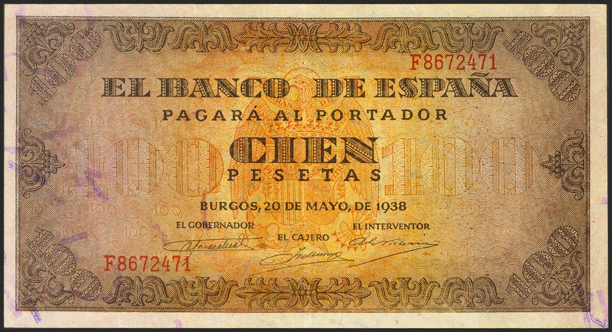 100 Pesetas. 20 de Mayo de 1938. Serie F. (Edifil 2021: 432a). Conserva parte de su apresto original. EBC.