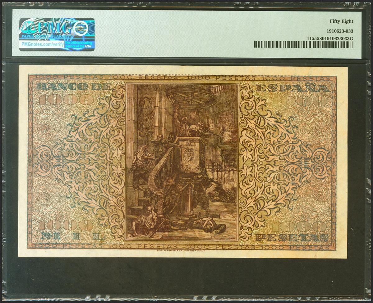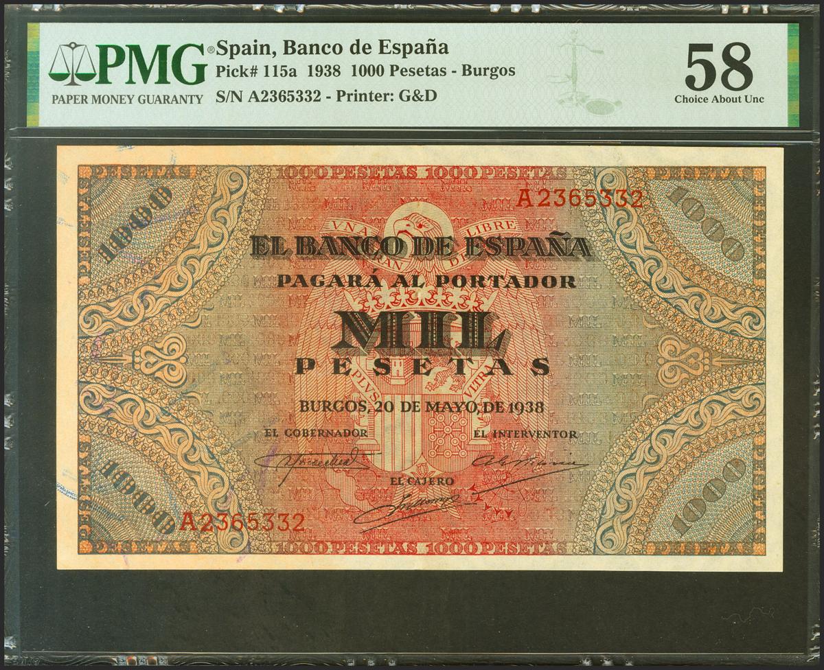 1000 Pesetas. 20 de Mayo de 1938. Serie A. (Edifil 2017: 434, Pick: 115a). Inusual en esta excepcional calidad. EBC++. Encapsulado PMG58.