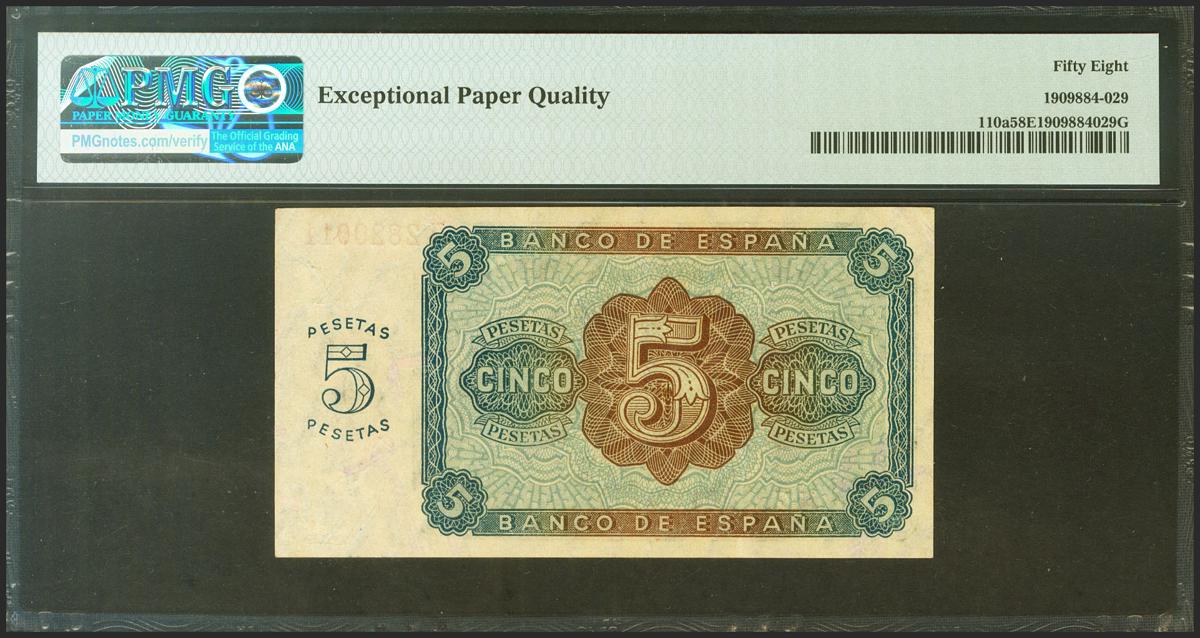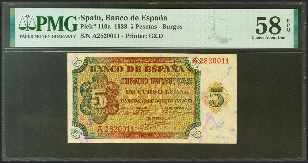 5 Pesetas. 10 de Agosto de 1938. Serie A. (Edifil 2021: 435, Pick: 110a). Apresto original. EBC+++. Encapsulado PMG58EPQ.