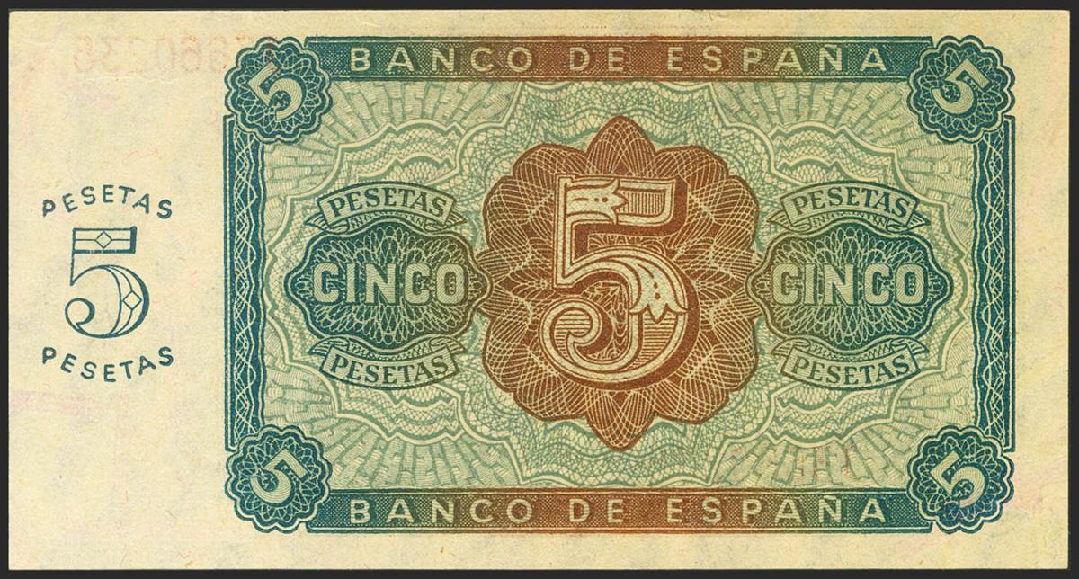5 Pesetas. 10 de Agosto de 1938. Serie J. (Edifil 2021: 435a). Apresto original. SC.