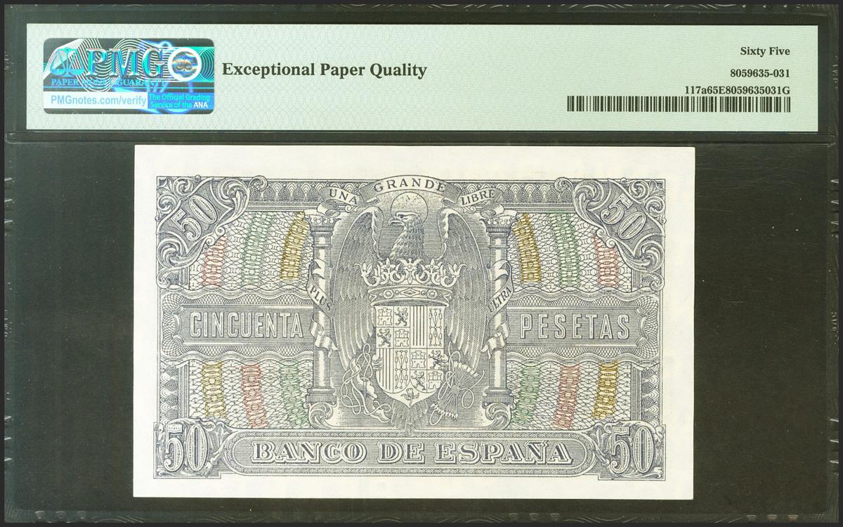 50 Pesetas. 9 de Enero de 1940. Serie C. (Edifil 2021: 437a, Pick: 117a). Raro en esta excepcional calidad, apresto original. SC. Encapsulado PMG65EPQ