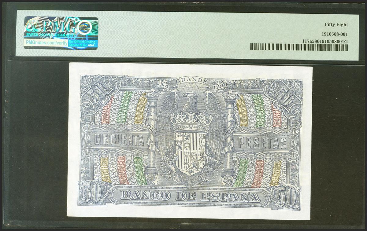50 Pesetas. 9 de Enero de 1940. Serie E, última serie emitida. (Edifil 2021: 437a, Pick: 117a). EBC++. Encapsulado PMG58.