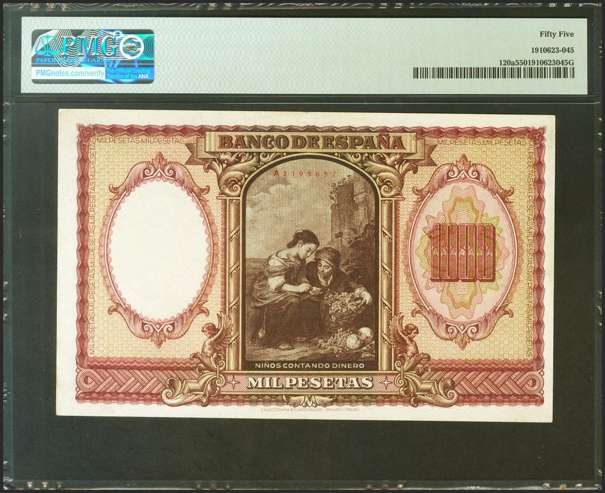1000 Pesetas. 9 de Enero de 1940. Serie A. (Edifil 2021: 440, Pick: 120a). Inusual en esta excepcional calidad. EBC+. Encapsulado PMG55.