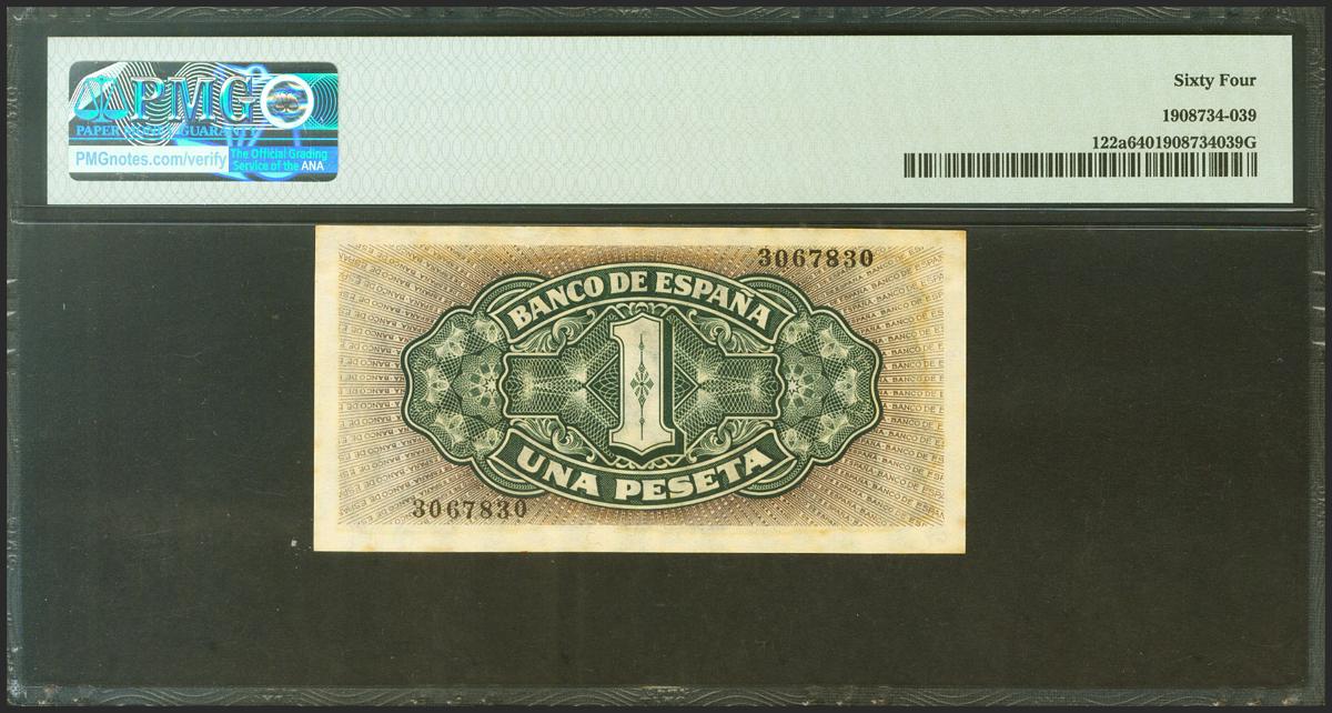 1 Peseta. 4 de Septiembre de 1940. Sin serie. (Edifil 2021: 442, Pick: 122a). Inusual. SC. Encapsulado PMG64.