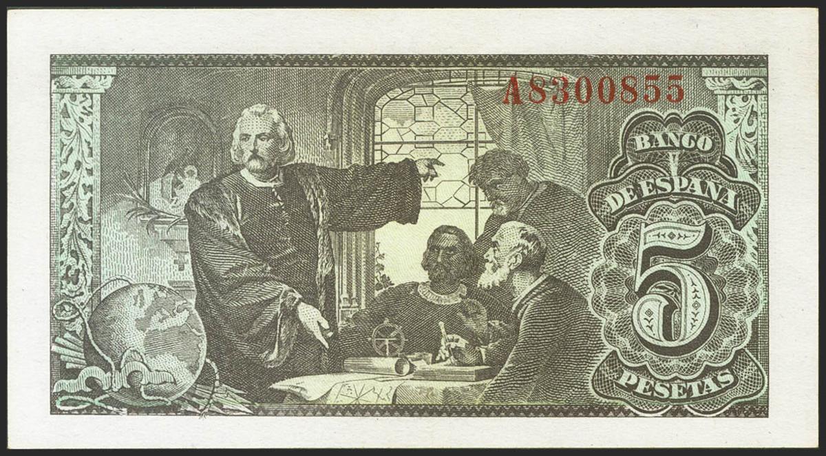 5 Pesetas. 13 de Febrero de 1943. Serie A. (Edifil 2021: 446a). Conserva gran parte de su apresto original. EBC++.