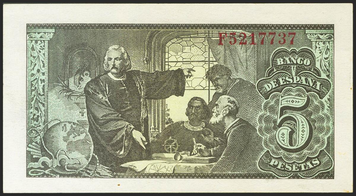 5 Pesetas. 13 de Febrero de 1943. Serie F. (Edifil 2021: 446a). Conserva gran parte de su apresto original. EBC++.