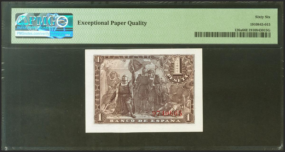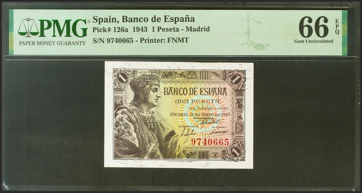 1 Peseta. 21 de Mayo de 1943. Sin serie. (Edifil 2021: 447, Pick: 126a). Inusual en esta excepcional calidad, apresto original. SC. Encapsulado PMG66EPQ.