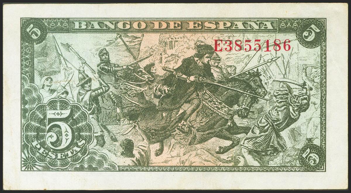 5 Pesetas. 15 de Junio de 1945. Serie E. (Edifil 2021: 449a). Conserva gran parte de su apresto original. EBC.