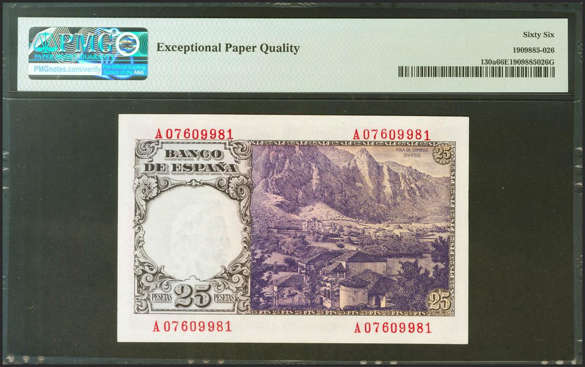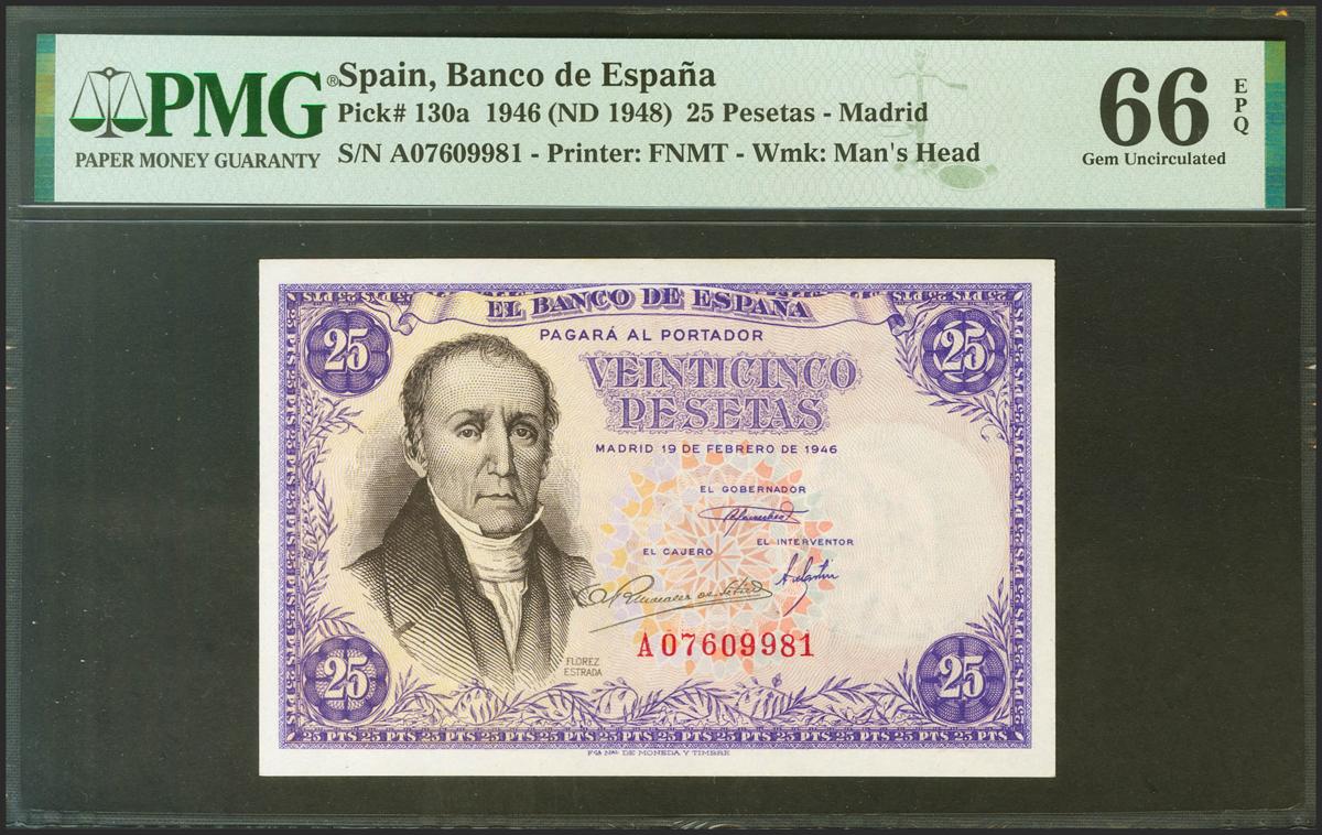 25 Pesetas. 20 de Febrero de 1946. Serie A. (Edifil 2021: 450a, Pick: 130a). Raro en esta excepcional calidad, apresto original. SC. Encapsulado PMG66EPQ.