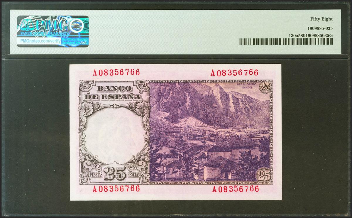 25 Pesetas. 20 de Febrero de 1946. Serie A. (Edifil 2021: 450a, Pick: 130a). EBC++. Encapsulado PMG58.