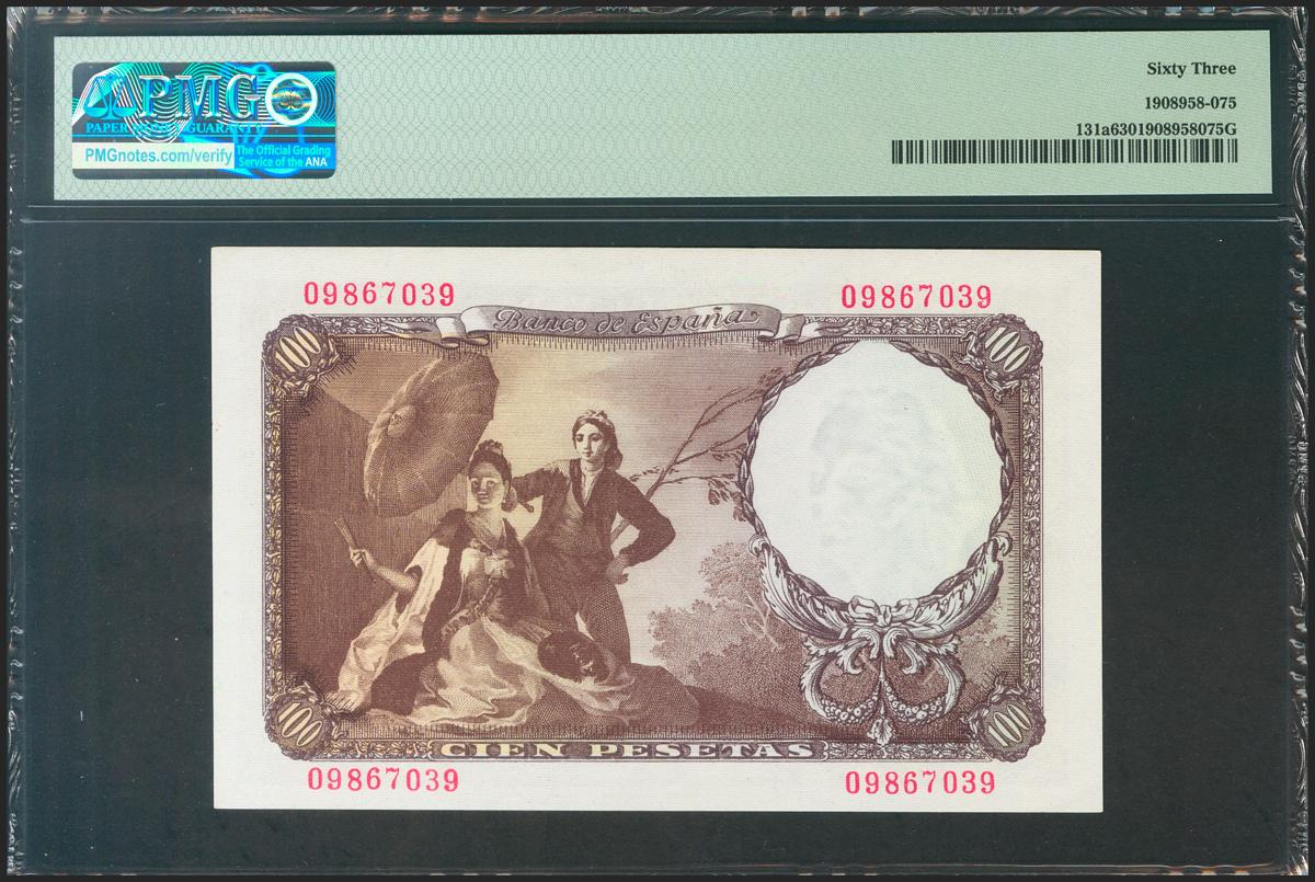 100 Pesetas. 19 de Febrero de 1946. Sin serie. (Edifil 2021: 451, Pick: 131a). Inusual en esta calidad. SC. Encapsulado PMG63.