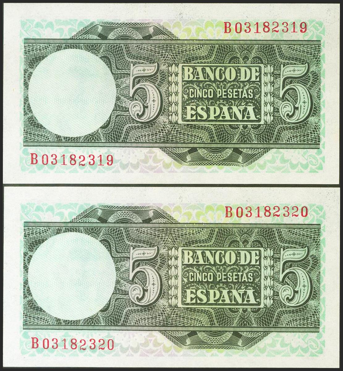 5 Pesetas. 5 de Marzo de 1948. Pareja correlativa. Serie B. (Edifil 2021: 455a). Apresto original. SC.