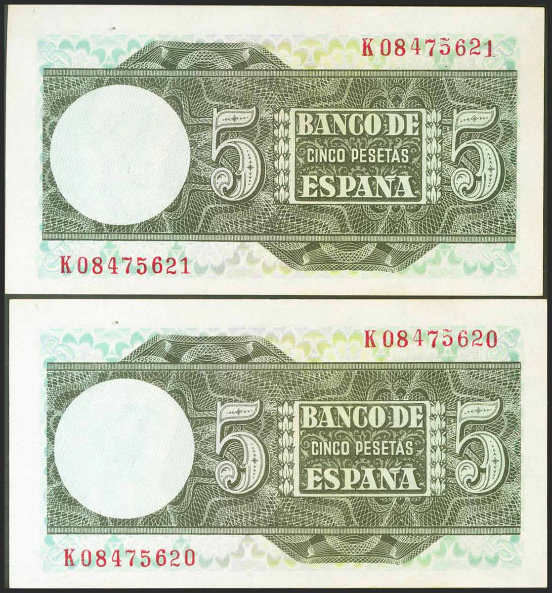 5 Pesetas. 5 de Marzo de 1948. Pareja correlativa. Serie K. (Edifil 2021: 455a). Apresto original. SC.