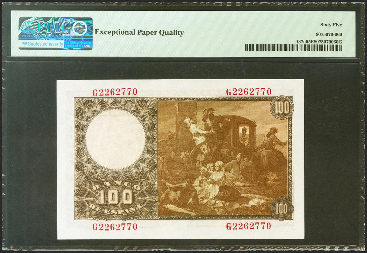 100 Pesetas. 2 de Mayo de 1948. Serie G. (Edifil 2021: 456a, Pick: 137a). Inusual en esta excepcional calidad, apresto original. SC. Encapsulado PMG65EPQ.