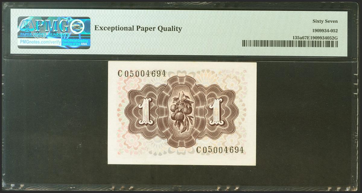 1 Peseta. 19 de Junio de 1948. Serie C. (Edifil 2021: 457a, Pick: 135a). Inusual en esta excepcional calidad, apresto original. SC. Encapsulado PMG67EPQ.