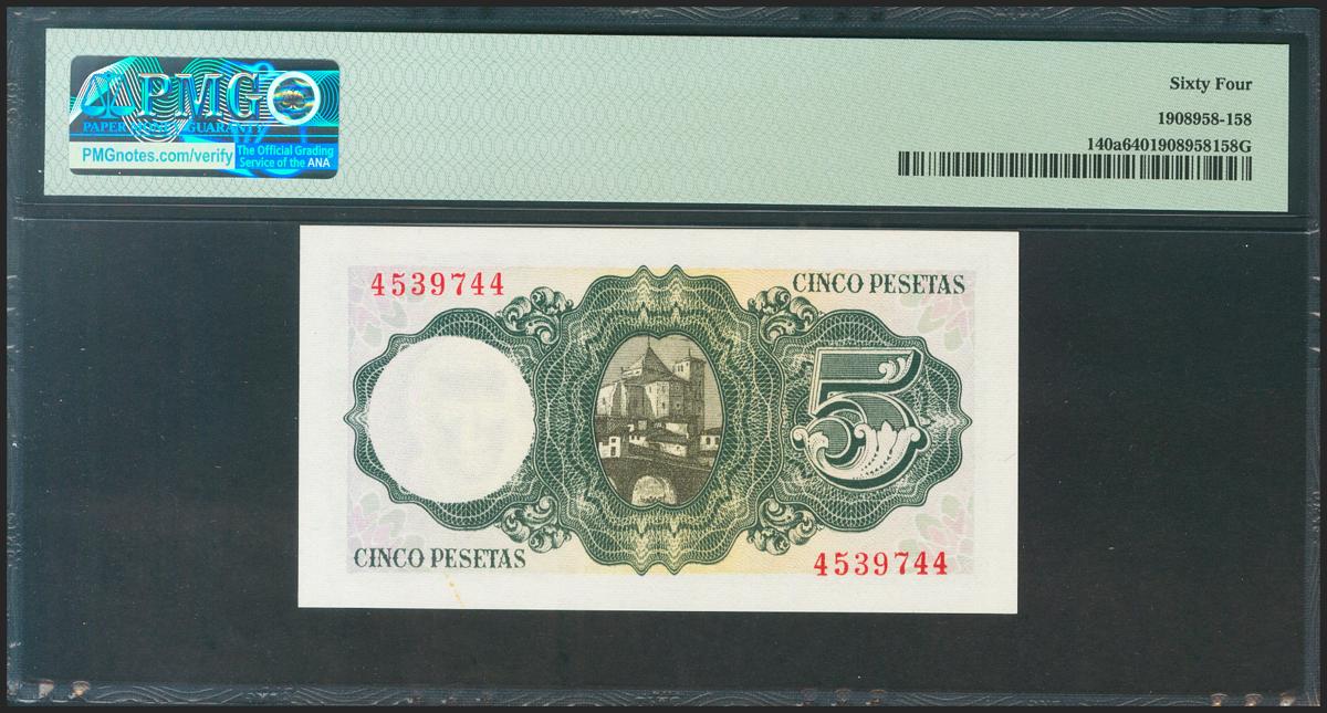 5 Pesetas. 16 de Agosto de 1951. Sin serie. (Edifil 2021: 459, Pick: 140a). Inusual en esta calidad. SC. Encapsulado PMG64.