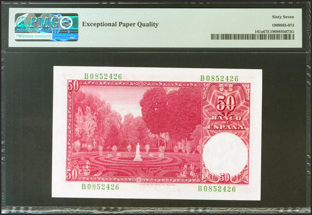 50 Pesetas. 31 de Diciembre de 1951. Serie B. (Edifil 2021: 462a, Pick: 141a). Raro en esta excepcional calidad, apresto original. SC. Encapsulado PMG67EPQ.