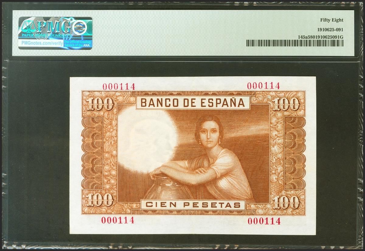 100 Pesetas. 7 de Abril de 1953. Sin serie y numeración bajísima. (Edifil 2021: 464, Pick: 145a). Extraordinariamente raro con una numeración tan baja. EBC++. Encapsulado PMG58.