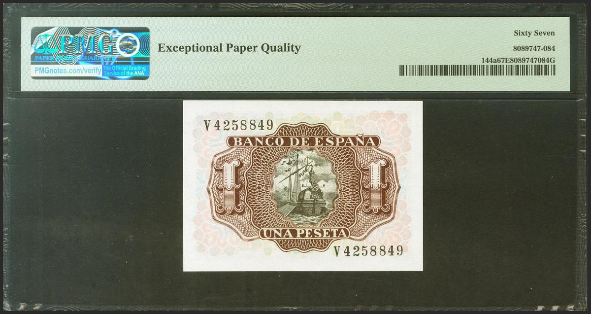 1 Peseta. 22 de Julio de 1953. Serie V. (Edifil 2021: 465a, Pick: 144a). Inusual en esta excepcional calidad, apresto original. SC. Encapsulado PMG67EPQ.