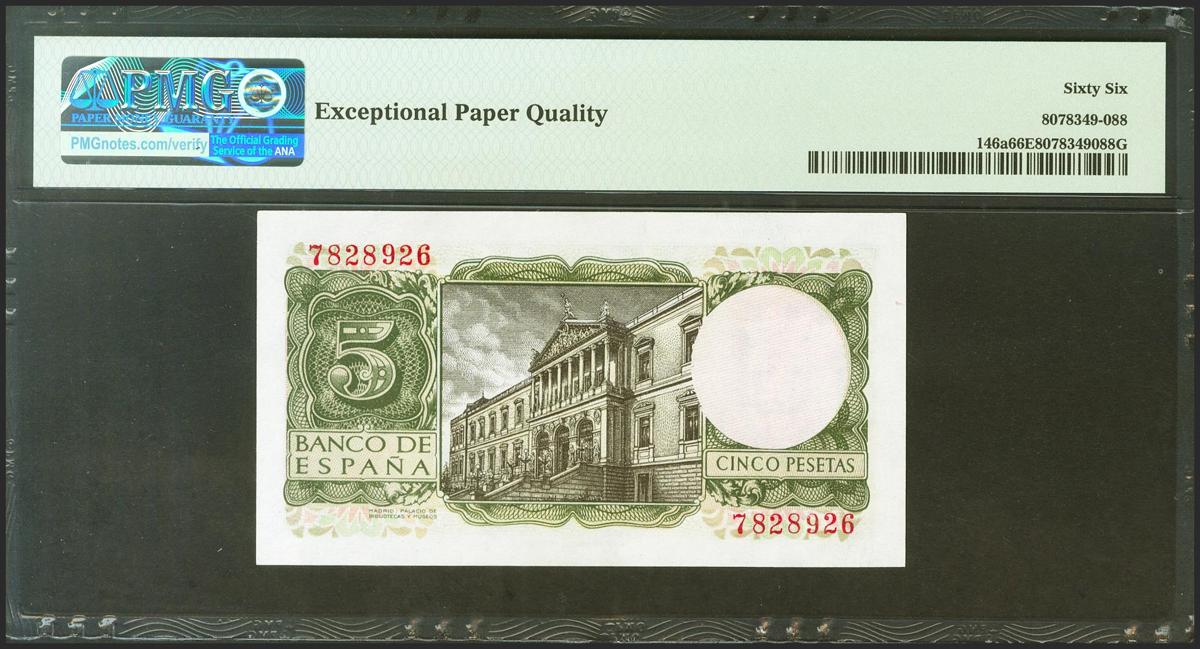 5 Pesetas. 22 de Julio de 1954. Sin serie. (Edifil 2021: 466, Pick: 146a). Inusual en esta excepcional calidad, apresto original. SC. Encapsulado PMG66EPQ.