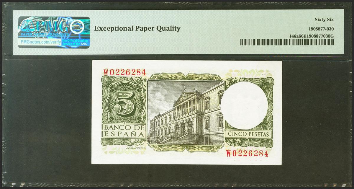 5 Pesetas. 22 de Julio de 1954. Serie W, última serie emitida. (Edifil 2021: 466b, Pick: 146a). Rarísima serie e inusual en esta excepcional calidad, apresto original. SC. Encapsulado PMG66EPQ.