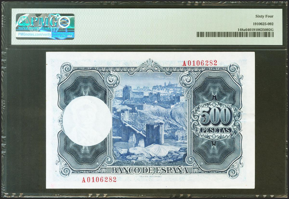 500 Pesetas. 22 de Julio de 1953. Serie A. (Edifil 2021: 468a, Pick: 148a). Inusual en esta calidad. SC. Encapsulado PMG64.