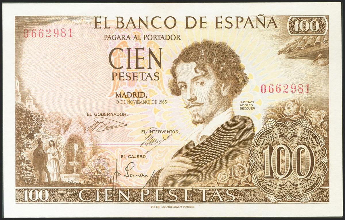100 Pesetas. 19 de Noviembre de 1965. Sin serie. (Edifil 2017: 470). Apresto original. EBC+.