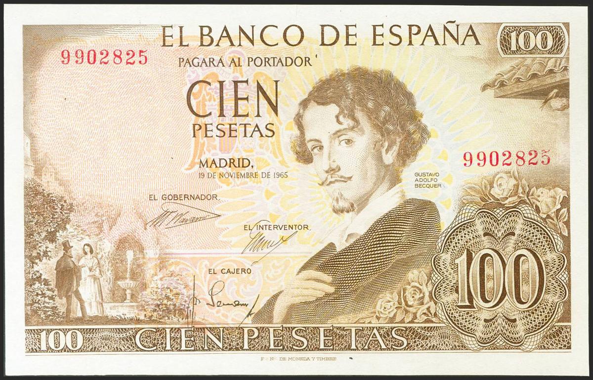 100 Pesetas. 19 de Noviembre de 1965. Sin serie. (Edifil 2021: 470). Conserva gran parte del apresto original. EBC.