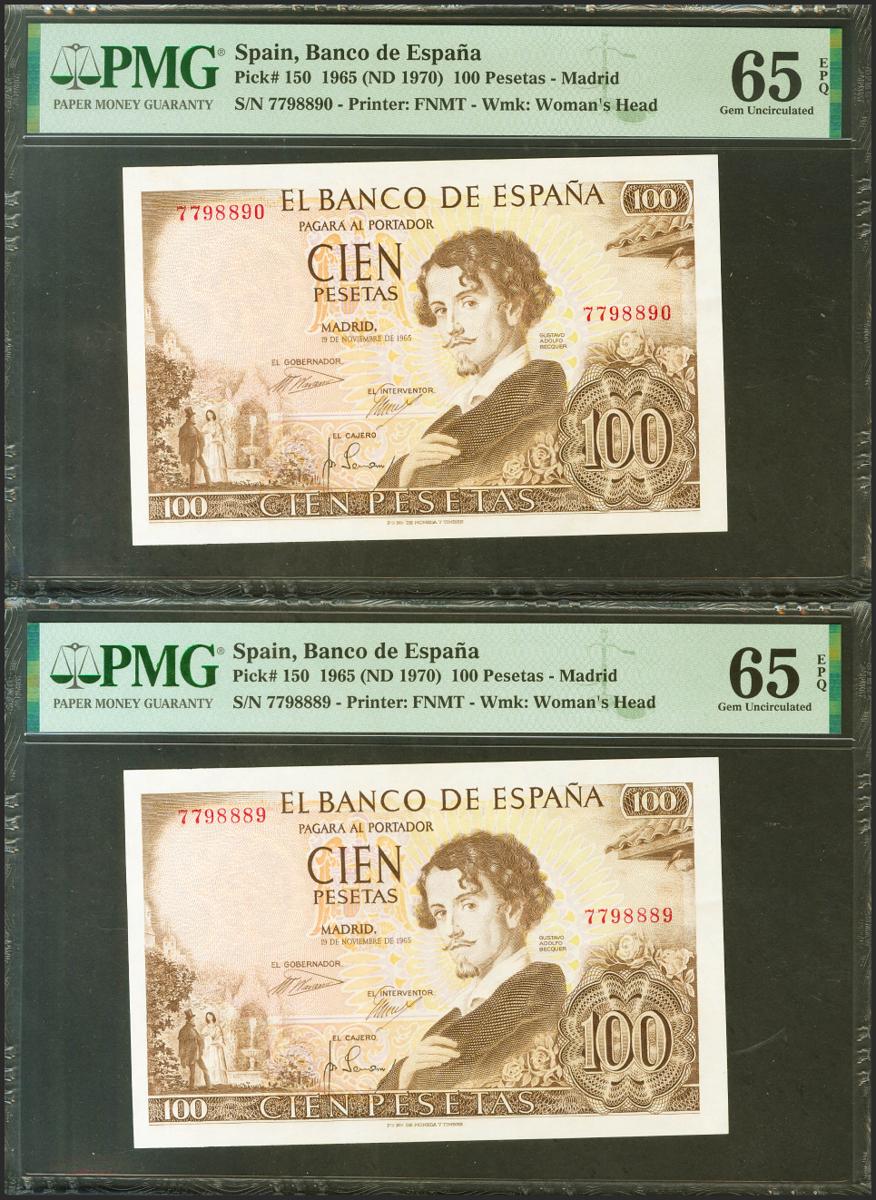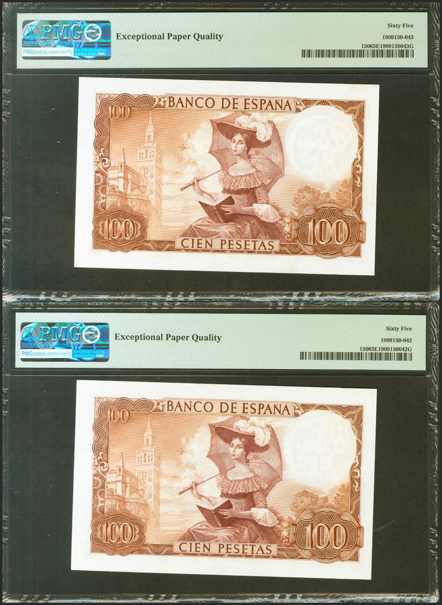 100 Pesetas. 19 de Noviembre de 1965. Pareja correlativa. Sin serie. (Edifil 2021: 470, Pick: 150). Apresto original. Encapsulados PMG65EPQ, ambos.
