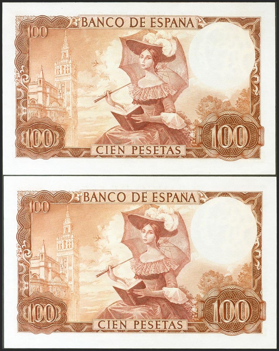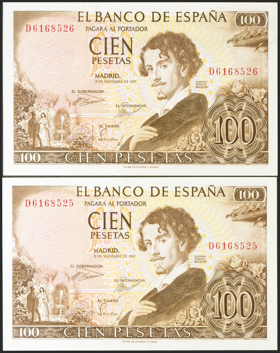 100 Pesetas. 19 de Noviembre de 1965. Pareja correlativa. Serie D. (Edifil 2021: 470a). Conserva todo su apresto original. SC-.