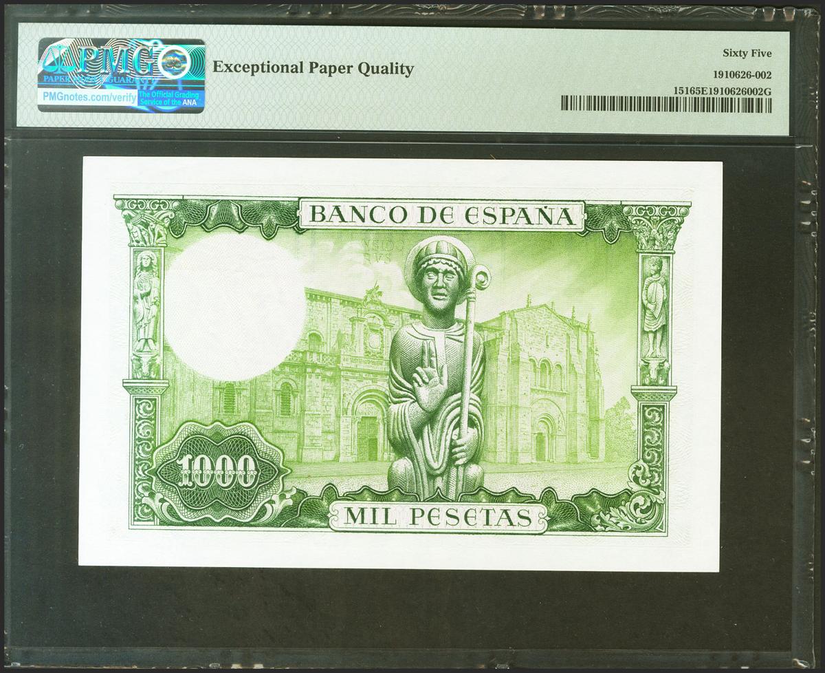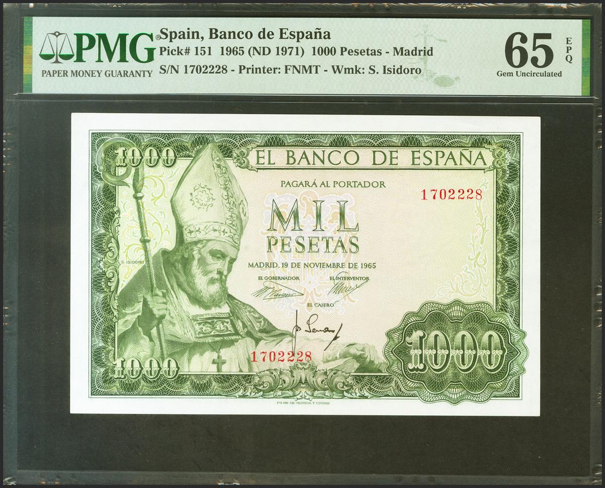 1000 Pesetas. 19 de Noviembre de 1965. Sin serie. (Edifil 2021: 471, Pick: 151). Inusual en esta excepcional calidad, apresto original. SC. Encapsulado PMG65EPQ.