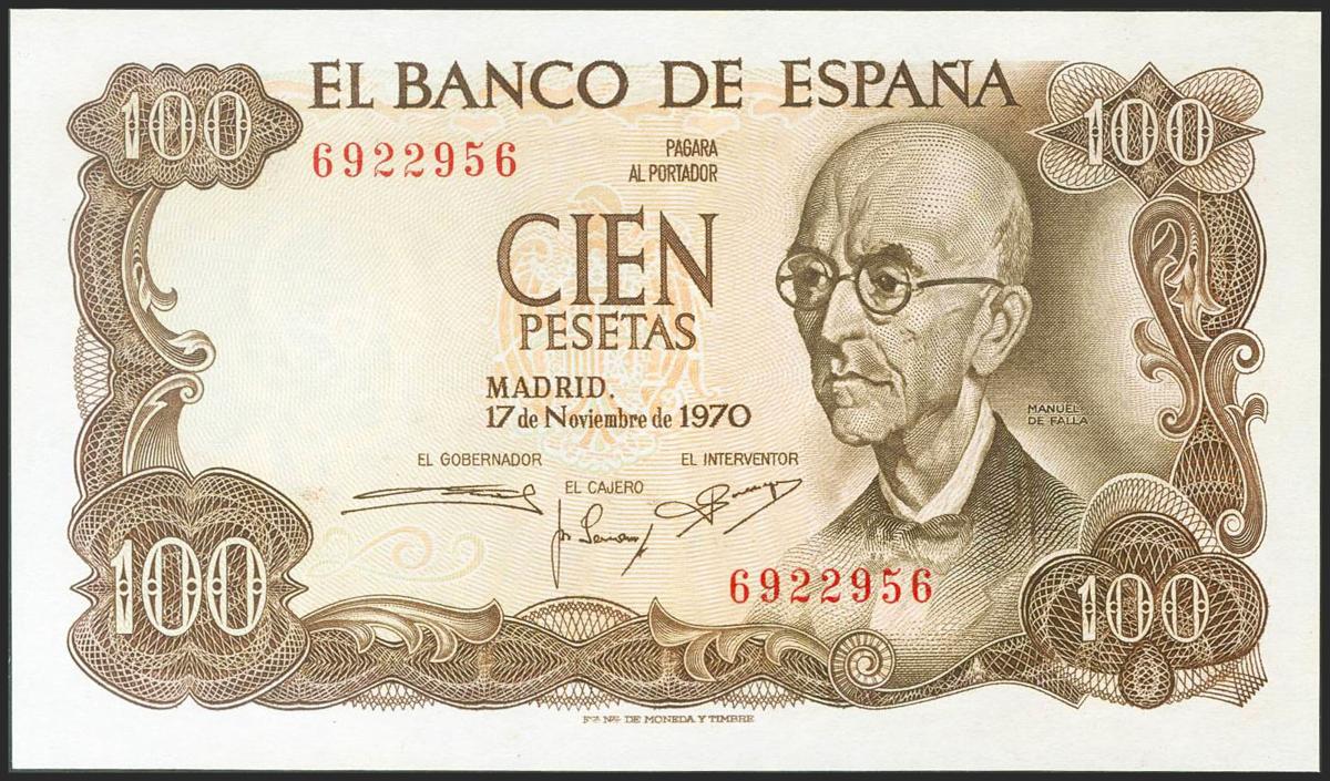 100 Pesetas. 17 de Noviembre de 1970. Sin serie. (Edifil 2021: 472). Apresto original. EBC.