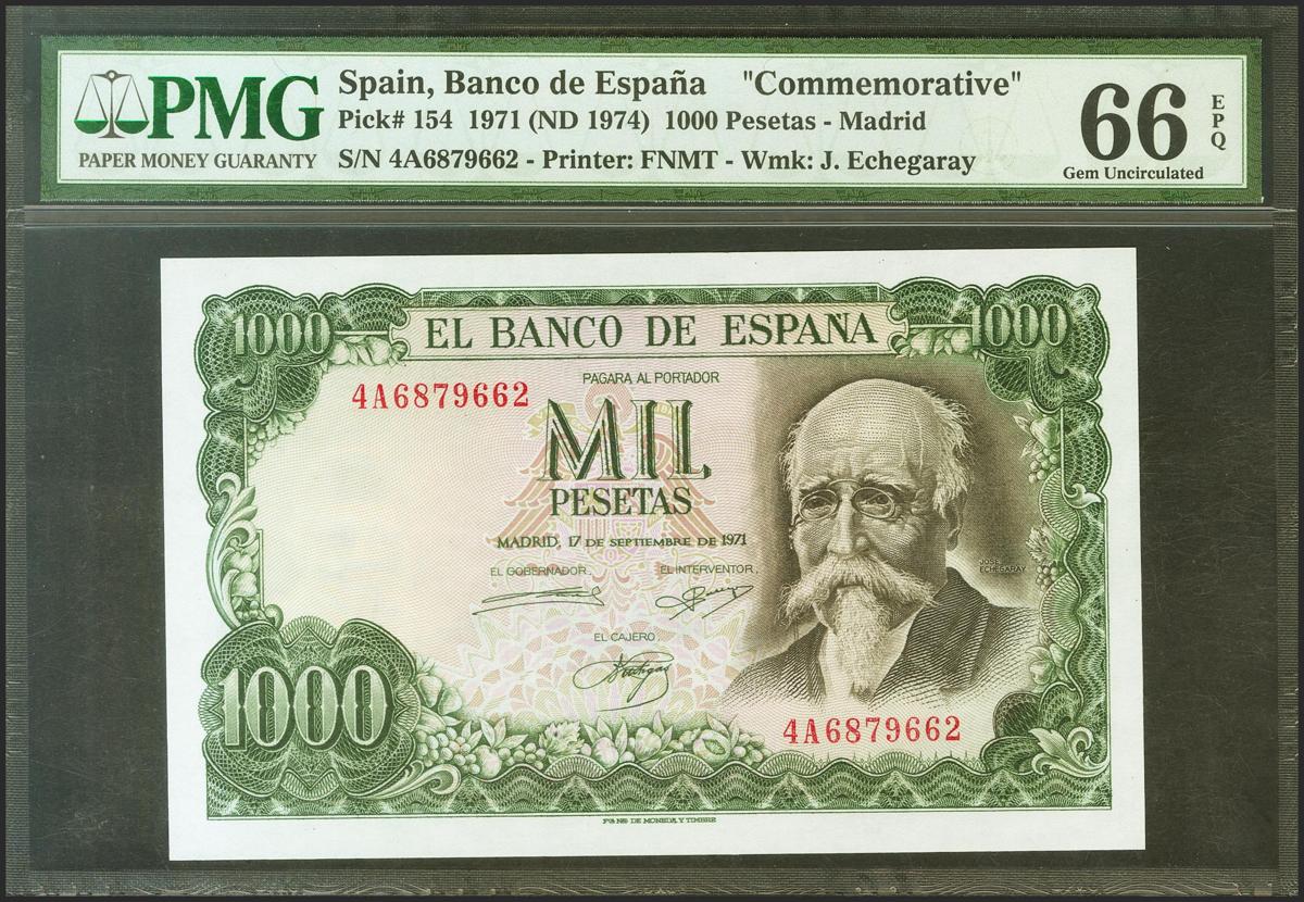 1000 Pesetas. 17 de Septiembre de 1971. Serie 4A. (Edifil 2021: 474c, Pick: 154). Raro en esta espectacular calidad, apresto original. SC. Encapsulado PMG66EPQ.